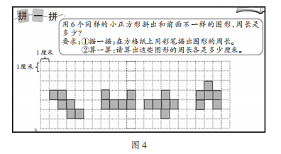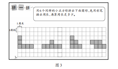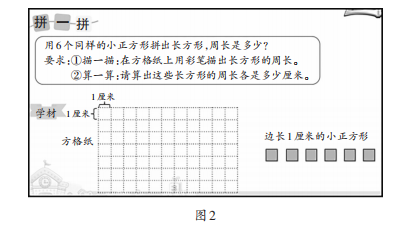 “周长是多少”是小学三年级“长方形和正方形”单元的实践活动内容,旨在将正方形进行拼合操作以形成新的图形,使学生切身感受周长的变化情况,进而探索其中蕴含的规律。