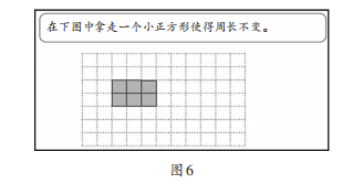 师(出示图6):接下来,我们再看一个新的问题。这是一个 3×2的长方形,如何去掉一个正方形,让周长不变呢?(学生思考并回答,教师引导学生结合图形分析)