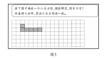 师(出示图5):通过前面的学习,相信大家对图形周长的变化已经有一定的认识。还是这6个小正方形拼成的图形,如果再加一个小正方形,看看摆在哪里能保证周长不变呢?