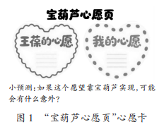 1.出示手册“宝葫芦心愿页”,含两张心愿卡:左侧“王葆的心愿”,引用课文信息填空,如“王葆想要宝葫芦,这样他______”;右侧“我的心愿”,用句式支架“如果我有宝葫芦,我会帮______(谁)______(做什么)”进行速写。下方设“小预测”栏:如果我的这个愿望靠宝葫芦实现,可能会有什么意外?(如图1所示)