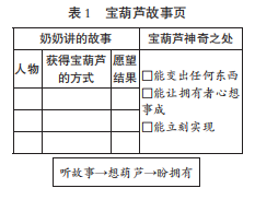 (1)出示手册“宝葫芦故事页”,左侧是“奶奶讲的故事”梳理表格,右侧为“宝葫芦神奇之处”勾选项,下方设有迷你思维导图(如表1所示)