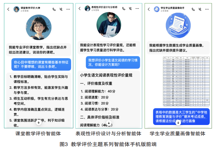 根据软件技术开发的复杂程度,可将测评工具分为专业级与轻量级两大类。专业级智能测评平台通常基于系统科学理论进行宏观架构,采用云计算、云存储、分布式处理技术,将教学过程中获取的多渠道、多模态数据进行快速存储、管理、整合、分析、反馈[18],这类平台可实现全域评价数据的深度挖掘与综合评估。轻量级测评工具开发应坚持“最小够用”原则,可根据特定评价任务进行模块化设计,实现快速部署,完成即时性评估任务。例如,图3为作者基于“豆包”大模型开发的三款教学评价智能体,基本满足了教学过程中的相关评价需求。