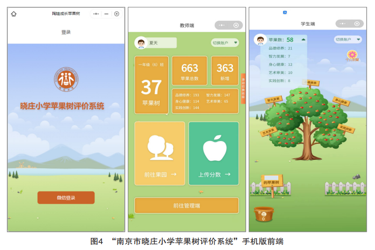 在健全综合评价方面,数智技术系统能整合学业表现、社会实践、身心发展等跨领域数据,生成多维度的综合素养评价画像;教师通过人机协作界定指标权重,平衡学生全面发展与个性发展的关系,实现综合育人的目的。图4所示为“南京市晓庄小学苹果树评价系统”的应用端示例,是德、智、体、美、劳五育融合的综合素养画像。