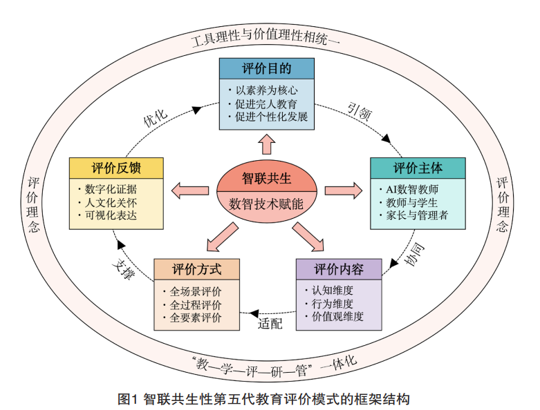 上述哲学层面的思索,揭示了数智时代评价从工具理性向价值理性回归的内在动力与外部需求,由此,笔者将第五代教育评价模式凝练为“智联共生性”评价。该评价模式以人的全面发展为核心目标,以数智技术为联结纽带,促成人机协同共生的交互生态,实现动态化、个性化、可视化的精准决策。