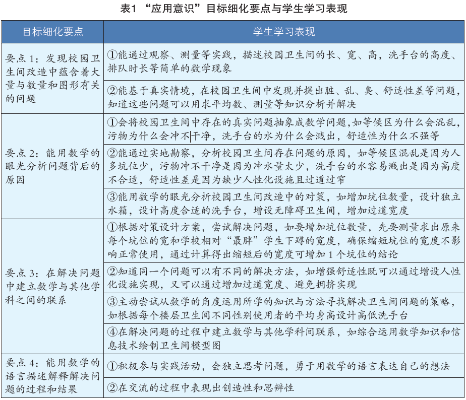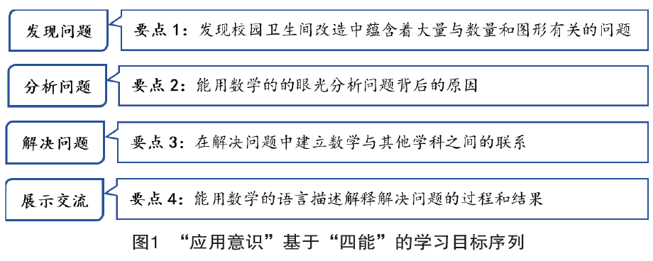 学科实践的落实离不开学习目标、学习过程以及学习评价三个方面,其中学习目标是灵魂,因此首先必须明确学习目标,教师需要知道让学生开展何种实践。[8]作为数学教师,笔者将“校园卫生间大改造”的数学核心素养表现聚焦于“应用意识”,并且基于“四能”,即发现问题、提出问题、分析问题和解决问题这四个层面将“应用意识”分解为素养目标的基本序列(图1),将之作为开发该项目式学习中学生学习表现的基础,进而将之“行为化、层级化”,使之成为项目表现性评价量规和表现性任务设计的重要参照(表1)。