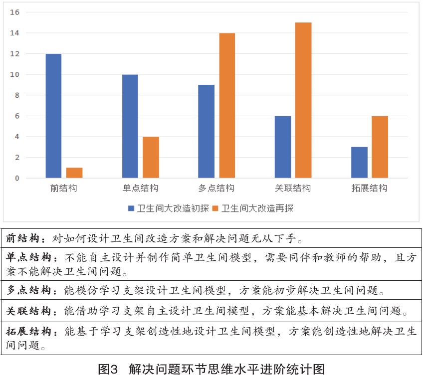第二,教师基于素养评价量规及表现性任务,构建差异化的学科实践支持系统,进一步鼓励学生通过辅助性支架,自主经历探究的完整过程,推动低阶思维向高阶思维发展。同时,学校基于SOLO分类理论研制思维水平测评量规,对两次项目实施中的学生思维水平进行测评,结果显示,支架辅助之下学生再次开展“校园卫生间大改造”项目时,由无从下手的前结构水平转变为能借助支架解决问题的多点、关联甚至拓展结构水平,思维水平得到提高(图3)。