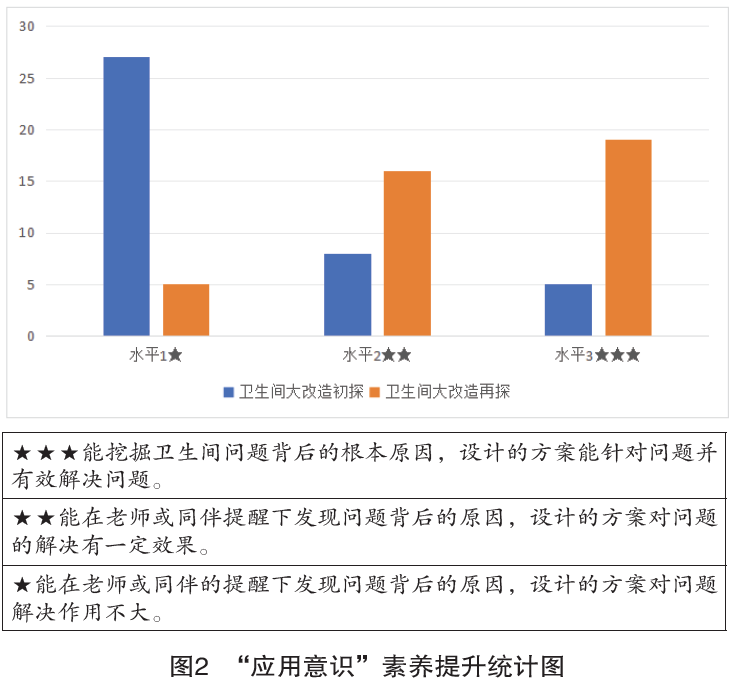 第一,教师依据课程标准要求,深入分析教材内容,探寻学生的真实问题,构建了基于真实问题的“校园卫生间大改造”小学数学项目式学习,研制了与项目相关的“应用意识”素养目标在具体实践内容中的进阶层级和表现标准,并基于标准设计表现性任务和表现性评价量规,深化了在实践中对学生核心素养的培育。同时,在两次项目式学习实践中,学校分别对40人的项目组进行了测评,数据显示,学生再次开展“校园卫生间大改造”项目时,少了一分过去纯粹创意型改造的天马行空,多了一分应用型改造的真实问题解决意识,学生数学学科素养在实践中悄然提升(图2)。