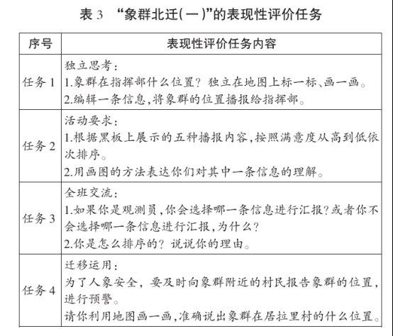 为了实现本节课的表现性评价目标,从“学—教—评”一致性的理念出发,笔者结合学生的学习起点和教材分析,将“象群北迁(一)”的表现性任务设计如下: