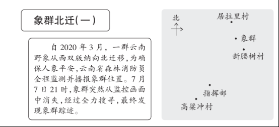 “象群北迁(一)”以2020年世界瞩目的云南野象北迁事件为载体,创设真实的问题情境,提出“象群在指挥部的什么位置?”这一核心问题。先鼓励学生独立思考,用文字的形式显现出学生空间描述的思维水平。接着让学生根据信息内容画出相应的图形,在与同伴交流后选择出“最能准确确定象群位置的信息”,进一步培养学生的几何直观能力,发展审思质疑的高阶思维。最后引导学生将所学到的方法进行迁移应用,解决相似的同类问题。对比以往不同版本的教材,苏教版教材是以轮船在航海中行驶为情境背景,再逐一提出“灯塔在轮船的什么方向?”“灯塔在轮船的北偏东多少度方向多少千米处?”的思考问题,让学生在“十字”坐标中用“( )偏( )”“( )度”来描述一个具体的位置,注重问题导向,知识理解。青岛版教材以军事演练为情境背景,提出“红军阵地在指挥部的什么位置?”的核心问题,鼓励学生合作探索,画“十字”坐标图分析问题,再对用方向、距离确定位置的内容进行巩固。青岛版教材注重让小组在开放性的问题情境中合作学习,发挥学生的主观能动性,但取材的情境与现今学生的生活相隔较远。人教版教材是以电视新闻播报台风中心位置为情境背景,让学生根据新闻信息直接理解“东偏南30°”和“1厘米表示100千米”的现实意义,仅注重知识理解,缺乏学生探究的主动性。
