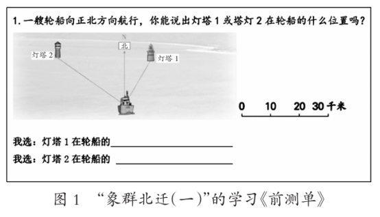 教学前测能够帮助教师精准定位学生的学习起点,了解学生在即将学习的内容上的基础水平和知识盲区,帮助教师设计出更具针对性的表现性评价任务,促进目标的达成。但有时,学生会呈现出已经理解某个知识内容的假象,如果仅仅分析学生完成的前测作品,容易引起教师误判“大多数学生都知道用方向和距离描述物体的位置,只是不能借助角度更精准地描述方向”,将教学重点转移到知识理解上,从而忽视学生思维的真正生长点。因此,教师应剖开学生对知识浅层理解的表象,深究学生对知识的深度理解。笔者通过扩大前测样本数量,对比分析两个班的前测结果,寻找学生对即将学习内容的思维共性,发现五年级学生根据已有的空间位置经验,知道用“方向”和“距离”确定物体的位置,但无法讲清“只用方向”或“只用距离”不能确定位置的理由。所以,在设计表现性任务时,充分给予学生探究、辨析的机会,进一步发展学生的空间想象能力。