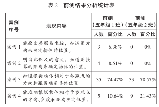 学生在第一学段的“图形与位置”中已能够用东、南、西、北等描述物体的绝对位置,知道东北、西北、东南、西南四个方向。在第二学段用有序的数对确定位置时,已进一步定量刻画了物体的位置,初步学习建立平面直角坐标系。基于学生已有的知识基础,为了更好地了解学生的学习起点,笔者以苏教版教材为依据,制定出能够反映学生不同思维水平的《前测单》(如图1),并对我校五年级两个班学生(1班47人,2班42人)进行前测。前测结果统计分析如表2。