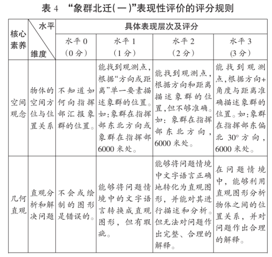 表现性评价指的是尽量在合乎情理的真实教学情境中,运用评分规则对学生完成复杂任务的过程表现或结果作出评价。因此,表现性评价不只是简单的评价工具,还是一种基于表现性任务的实践活动。这样的活动是通过表现性任务将学生的思维可视化,根据学生在面对问题任务时的一些真实行为和真实信息,对学生的思维进行评价,进而作出教学调整。表现性评价具有很强的任务感和真实性,是聚集核心素养、开展小学数学深度教学的重要手段。下面以《象群北迁(一)》一课为例,探索素养导向下小学数学表现性评价教学的实践路径。