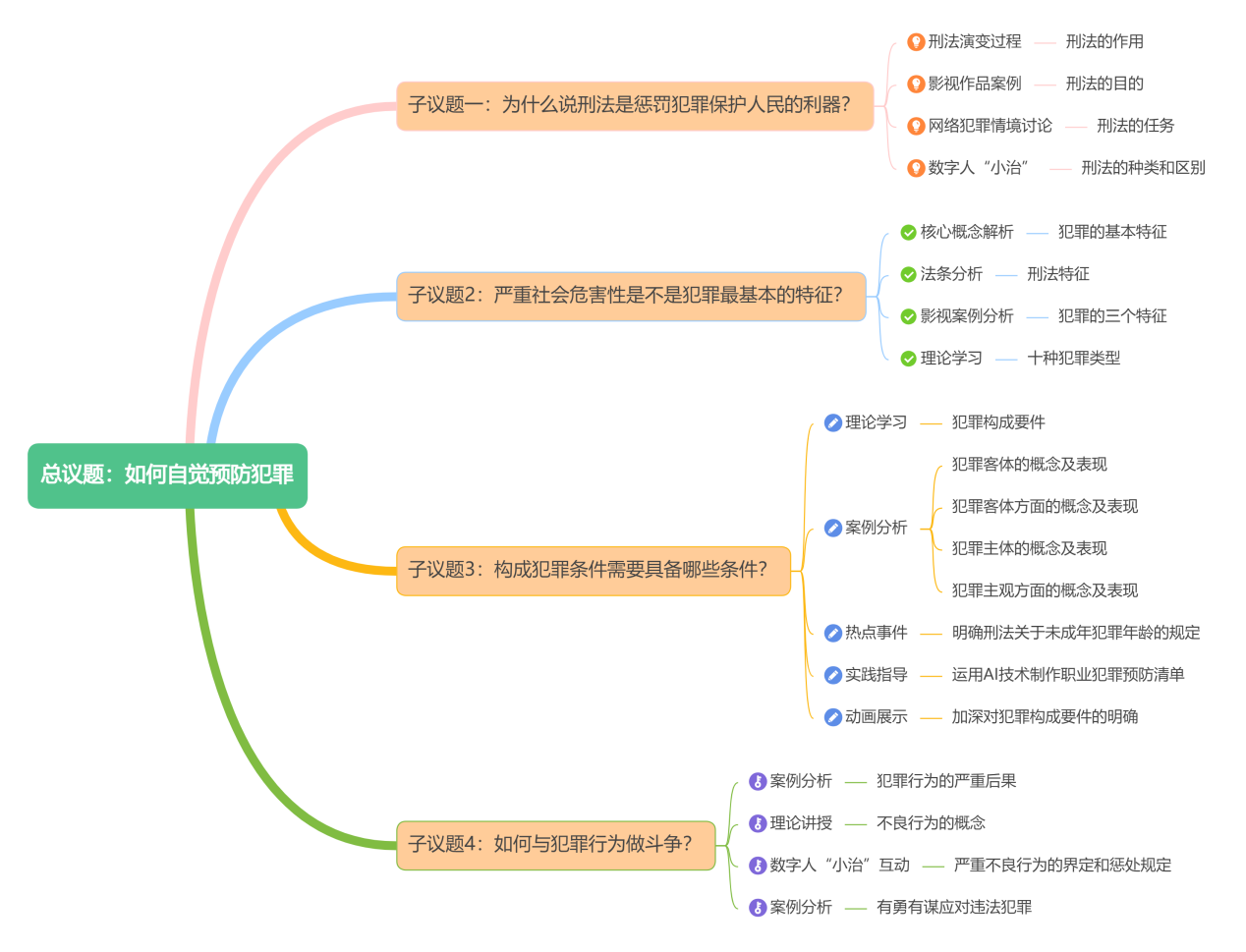 设计思路 | 本课程以学科核心素养培育为导向,结合学情分析,围绕“是什么—为什么—怎么做”展开,通过四个子议题实现“畏法(崇法)—明法—护法”三阶递进,回答“如何自觉预防犯罪”这个总议题。 一、微课1:为什么说刑法是惩罚犯罪保护人民的利器?(崇法:刑法的目的与任务) 播放《第二十条》片段,展示刑法对正当防卫的保护,引出问题:“为何刑法是‘惩罚犯罪、保护人民’的利器?”通过管仲名言和“醉驾入刑”数据,阐释刑法的目的(惩罚犯罪、保护人民)与任务(维护社会秩序)。对比“孙伟铭案”与“网络诈骗案例”,说明刑法通过威慑和惩罚实现社会公平。坚定法治信仰,理解刑法是社会主义法治的基石。 二、微课2:严重社会危害性是不是犯罪最基本的特征?(明法:犯罪的特征) 案例驱动:分析《狂飙》高启强案,设问:“为何他的行为必须严惩?”,解析犯罪三特征(社会危害性、刑事违法性、应受刑罚性)。结合黑社会犯罪、校园暴力等案例,强调严重社会危害性是犯罪最本质特征。分析“一般违法vs犯罪”,强化法律认知。 三、微课3:构成犯罪需要具备哪些条件?(明法:犯罪的构成要件) 通过热点案例:邯郸校园暴力案,设问:“13岁少年杀人为何被判刑?”,解析犯罪四要件(客体、客观方面、主体、主观方面)。结合《刑法修正案(十一)》下调刑责年龄,说明法律对严重犯罪的零容忍。 运用AI模拟“职业法律风险测试”,警示未来职场中的法律红线。 四、微课4:如何与犯罪行为做斗争?(护法:预防与应对策略) 对照《预防未成年人犯罪法》,列举不良行为与矫治措施。通过“田某正当防卫案”,教授“有勇有谋”斗争策略(如报警优先、正当防卫限度)。播放《第二十条》“法不能向不法低头”台词,激励学生做法治的捍卫者。 五、通过弹窗思考题、课后习题的方式检测学生学习效果,并巩固教学重难点。